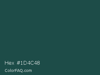 Hex #1d4c48 Color is a very dark cyan color and the nearest color is Brunswick Green #1b4d3e. Hex code #1d4c48 and RGB value is rgb(29,76,72). In RGB color space, this color is composed of 11% red, 30% green, 28% blue, In CMYK color space, this color is composed of 62% cyan, 0% magenta, 5% yellow , 70% black , In HSL color space, this color has a hue angle of 175° , 45% saturation and 21% lightness.
