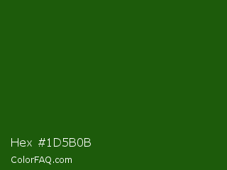 Hex #1d5b0b Color is a very dark green color and the nearest color is Lincoln Green #195905. Hex code #1d5b0b and RGB value is rgb(29,91,11). In RGB color space, this color is composed of 11% red, 36% green, 4% blue, In CMYK color space, this color is composed of 68% cyan, 0% magenta, 88% yellow , 64% black , In HSL color space, this color has a hue angle of 107° , 78% saturation and 20% lightness.