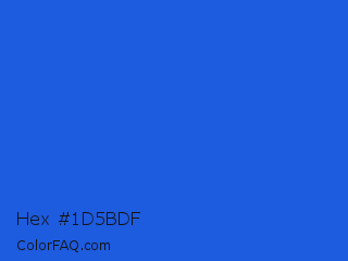 Hex #1d5bdf Color is a normal blue color and the nearest color is Mariner #286acd. Hex code #1d5bdf and RGB value is rgb(29,91,223). In RGB color space, this color is composed of 11% red, 36% green, 87% blue, In CMYK color space, this color is composed of 87% cyan, 59% magenta, 0% yellow , 13% black , In HSL color space, this color has a hue angle of 221° , 77% saturation and 49% lightness.