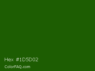 Hex #1d5d02 Color is a very dark green color and the nearest color is Lincoln Green #195905. Hex code #1d5d02 and RGB value is rgb(29,93,2). In RGB color space, this color is composed of 11% red, 36% green, 1% blue, In CMYK color space, this color is composed of 69% cyan, 0% magenta, 98% yellow , 64% black , In HSL color space, this color has a hue angle of 102° , 96% saturation and 19% lightness.