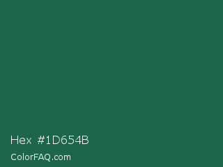 Hex #1d654b Color is a dark green color and the nearest color is Green Pea #1d6142. Hex code #1d654b and RGB value is rgb(29,101,75). In RGB color space, this color is composed of 11% red, 40% green, 29% blue, In CMYK color space, this color is composed of 71% cyan, 0% magenta, 26% yellow , 60% black , In HSL color space, this color has a hue angle of 158° , 55% saturation and 25% lightness.