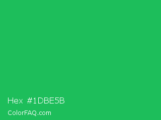 Hex #1dbe5b Color is a normal green color and the nearest color is Green Crayola #1cac78. Hex code #1dbe5b and RGB value is rgb(29,190,91). In RGB color space, this color is composed of 11% red, 75% green, 36% blue, In CMYK color space, this color is composed of 85% cyan, 0% magenta, 52% yellow , 25% black , In HSL color space, this color has a hue angle of 143° , 74% saturation and 43% lightness.