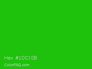 Hex #1dc10b Color is a normal green color and the nearest color is Harlequin Green #46cb18. Hex code #1dc10b and RGB value is rgb(29,193,11). In RGB color space, this color is composed of 11% red, 76% green, 4% blue, In CMYK color space, this color is composed of 85% cyan, 0% magenta, 94% yellow , 24% black , In HSL color space, this color has a hue angle of 114° , 89% saturation and 40% lightness.