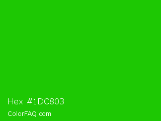 Hex #1dc803 Color is a normal green color and the nearest color is Harlequin Green #46cb18. Hex code #1dc803 and RGB value is rgb(29,200,3). In RGB color space, this color is composed of 11% red, 78% green, 1% blue, In CMYK color space, this color is composed of 86% cyan, 0% magenta, 99% yellow , 22% black , In HSL color space, this color has a hue angle of 112° , 97% saturation and 40% lightness.