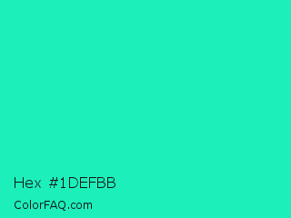 Hex #1defbb Color is a normal cyan color and the nearest color is Turquoise PWG #30d5c8. Hex code #1defbb and RGB value is rgb(29,239,187). In RGB color space, this color is composed of 11% red, 94% green, 73% blue, In CMYK color space, this color is composed of 88% cyan, 0% magenta, 22% yellow , 6% black , In HSL color space, this color has a hue angle of 165° , 87% saturation and 53% lightness.