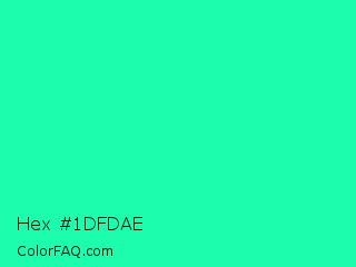 Hex #1dfdae Color is a normal green color and the nearest color is Medium Spring Green #00fa9a. Hex code #1dfdae and RGB value is rgb(29,253,174). In RGB color space, this color is composed of 11% red, 99% green, 68% blue, In CMYK color space, this color is composed of 89% cyan, 0% magenta, 31% yellow , 1% black , In HSL color space, this color has a hue angle of 159° , 98% saturation and 55% lightness.