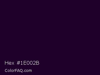 Hex #1e002b Color is a almost black purple color and the nearest color is Jacaranda #2e0329. Hex code #1e002b and RGB value is rgb(30,0,43). In RGB color space, this color is composed of 12% red, 0% green, 17% blue, In CMYK color space, this color is composed of 30% cyan, 100% magenta, 0% yellow , 83% black , In HSL color space, this color has a hue angle of 282° , 100% saturation and 8% lightness.