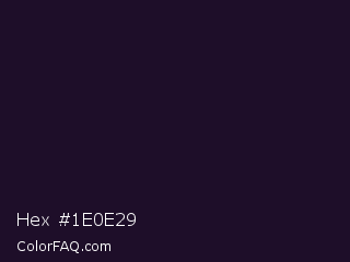 Hex #1e0e29 Color is a very dark purple color and the nearest color is Haiti #1b1035. Hex code #1e0e29 and RGB value is rgb(30,14,41). In RGB color space, this color is composed of 12% red, 5% green, 16% blue, In CMYK color space, this color is composed of 27% cyan, 66% magenta, 0% yellow , 84% black , In HSL color space, this color has a hue angle of 276° , 49% saturation and 11% lightness.