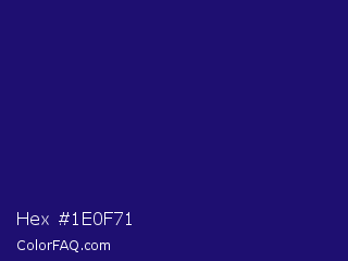 Hex #1e0f71 Color is a dark indigo color and the nearest color is Deep Blue #220878. Hex code #1e0f71 and RGB value is rgb(30,15,113). In RGB color space, this color is composed of 12% red, 6% green, 44% blue, In CMYK color space, this color is composed of 73% cyan, 87% magenta, 0% yellow , 56% black , In HSL color space, this color has a hue angle of 249° , 77% saturation and 25% lightness.