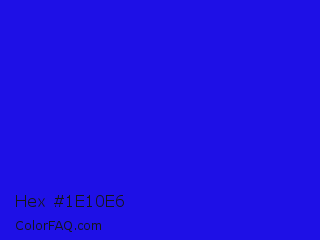 Hex #1e10e6 Color is a normal indigo color and the nearest color is Bluebonnet #1c1cf0. Hex code #1e10e6 and RGB value is rgb(30,16,230). In RGB color space, this color is composed of 12% red, 6% green, 90% blue, In CMYK color space, this color is composed of 87% cyan, 93% magenta, 0% yellow , 10% black , In HSL color space, this color has a hue angle of 244° , 87% saturation and 48% lightness.