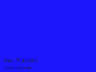 Hex #1e16fa Color is a normal indigo color and the nearest color is Bluebonnet #1c1cf0. Hex code #1e16fa and RGB value is rgb(30,22,250). In RGB color space, this color is composed of 12% red, 9% green, 98% blue, In CMYK color space, this color is composed of 88% cyan, 91% magenta, 0% yellow , 2% black , In HSL color space, this color has a hue angle of 242° , 96% saturation and 53% lightness.