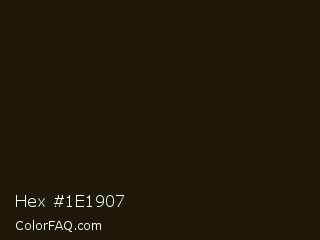 Hex #1e1907 Color is a almost black yellow color and the nearest color is El Paso #1e1708. Hex code #1e1907 and RGB value is rgb(30,25,7). In RGB color space, this color is composed of 12% red, 10% green, 3% blue, In CMYK color space, this color is composed of 0% cyan, 17% magenta, 77% yellow , 88% black , In HSL color space, this color has a hue angle of 47° , 62% saturation and 7% lightness.