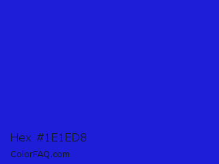 Hex #1e1ed8 Color is a normal blue color and the nearest color is Bluebonnet #1c1cf0. Hex code #1e1ed8 and RGB value is rgb(30,30,216). In RGB color space, this color is composed of 12% red, 12% green, 85% blue, In CMYK color space, this color is composed of 86% cyan, 86% magenta, 0% yellow , 15% black , In HSL color space, this color has a hue angle of 240° , 76% saturation and 48% lightness.