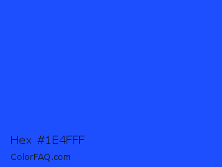 Hex #1e4fff Color is a normal blue color and the nearest color is Blue RYB #0247fe. Hex code #1e4fff and RGB value is rgb(30,79,255). In RGB color space, this color is composed of 12% red, 31% green, 100% blue, In CMYK color space, this color is composed of 88% cyan, 69% magenta, 0% yellow , 0% black , In HSL color space, this color has a hue angle of 227° , 100% saturation and 56% lightness.