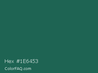 Hex #1e6453 Color is a dark cyan color and the nearest color is Green Pea #1d6142. Hex code #1e6453 and RGB value is rgb(30,100,83). In RGB color space, this color is composed of 12% red, 39% green, 33% blue, In CMYK color space, this color is composed of 70% cyan, 0% magenta, 17% yellow , 61% black , In HSL color space, this color has a hue angle of 165° , 54% saturation and 25% lightness.