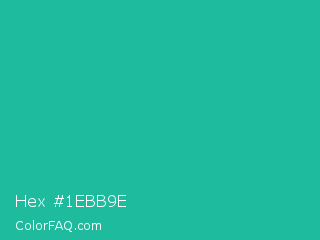 Hex #1ebb9e Color is a normal cyan color and the nearest color is Light Sea Green #20b2aa. Hex code #1ebb9e and RGB value is rgb(30,187,158). In RGB color space, this color is composed of 12% red, 73% green, 62% blue, In CMYK color space, this color is composed of 84% cyan, 0% magenta, 16% yellow , 27% black , In HSL color space, this color has a hue angle of 169° , 72% saturation and 43% lightness.