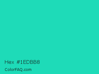 Hex #1edbb8 Color is a normal cyan color and the nearest color is Turquoise PWG #30d5c8. Hex code #1edbb8 and RGB value is rgb(30,219,184). In RGB color space, this color is composed of 12% red, 86% green, 72% blue, In CMYK color space, this color is composed of 86% cyan, 0% magenta, 16% yellow , 14% black , In HSL color space, this color has a hue angle of 169° , 76% saturation and 49% lightness.