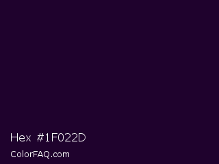 Hex #1f022d Color is a almost black purple color and the nearest color is Jacaranda #2e0329. Hex code #1f022d and RGB value is rgb(31,2,45). In RGB color space, this color is composed of 12% red, 1% green, 18% blue, In CMYK color space, this color is composed of 31% cyan, 96% magenta, 0% yellow , 82% black , In HSL color space, this color has a hue angle of 280° , 91% saturation and 9% lightness.