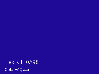 Hex #1f0a98 Color is a normal indigo color and the nearest color is Ultramarine #120a8f. Hex code #1f0a98 and RGB value is rgb(31,10,152). In RGB color space, this color is composed of 12% red, 4% green, 60% blue, In CMYK color space, this color is composed of 80% cyan, 93% magenta, 0% yellow , 40% black , In HSL color space, this color has a hue angle of 249° , 88% saturation and 32% lightness.