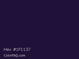 Hex #1f1137 Color is a very dark violet color and the nearest color is Haiti #1b1035. Hex code #1f1137 and RGB value is rgb(31,17,55). In RGB color space, this color is composed of 12% red, 7% green, 22% blue, In CMYK color space, this color is composed of 44% cyan, 69% magenta, 0% yellow , 78% black , In HSL color space, this color has a hue angle of 262° , 53% saturation and 14% lightness.