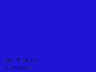 Hex #1f15d5 Color is a normal indigo color and the nearest color is Interdimensional Blue #360ccc. Hex code #1f15d5 and RGB value is rgb(31,21,213). In RGB color space, this color is composed of 12% red, 8% green, 84% blue, In CMYK color space, this color is composed of 85% cyan, 90% magenta, 0% yellow , 16% black , In HSL color space, this color has a hue angle of 243° , 82% saturation and 46% lightness.