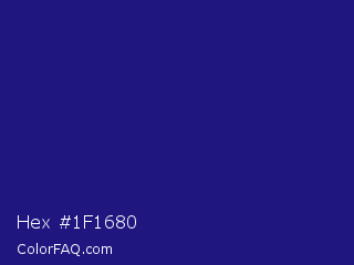 Hex #1f1680 Color is a dark indigo color and the nearest color is Deep Koamaru #1b127b. Hex code #1f1680 and RGB value is rgb(31,22,128). In RGB color space, this color is composed of 12% red, 9% green, 50% blue, In CMYK color space, this color is composed of 76% cyan, 83% magenta, 0% yellow , 50% black , In HSL color space, this color has a hue angle of 245° , 71% saturation and 29% lightness.