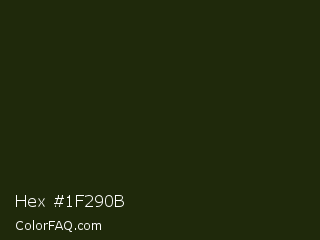 Hex #1f290b Color is a very dark green color and the nearest color is Deep Forest Green #182d09. Hex code #1f290b and RGB value is rgb(31,41,11). In RGB color space, this color is composed of 12% red, 16% green, 4% blue, In CMYK color space, this color is composed of 24% cyan, 0% magenta, 73% yellow , 84% black , In HSL color space, this color has a hue angle of 80° , 58% saturation and 10% lightness.