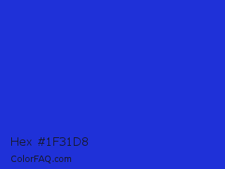Hex #1f31d8 Color is a normal blue color and the nearest color is Palatinate Blue #273be2. Hex code #1f31d8 and RGB value is rgb(31,49,216). In RGB color space, this color is composed of 12% red, 19% green, 85% blue, In CMYK color space, this color is composed of 86% cyan, 77% magenta, 0% yellow , 15% black , In HSL color space, this color has a hue angle of 234° , 75% saturation and 48% lightness.