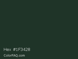 Hex #1f3428 Color is a very dark green color and the nearest color is Medium Jungle Green #1c352d. Hex code #1f3428 and RGB value is rgb(31,52,40). In RGB color space, this color is composed of 12% red, 20% green, 16% blue, In CMYK color space, this color is composed of 40% cyan, 0% magenta, 23% yellow , 80% black , In HSL color space, this color has a hue angle of 146° , 25% saturation and 16% lightness.