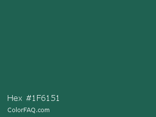 Hex #1f6151 Color is a dark cyan color and the nearest color is Green Pea #1d6142. Hex code #1f6151 and RGB value is rgb(31,97,81). In RGB color space, this color is composed of 12% red, 38% green, 32% blue, In CMYK color space, this color is composed of 68% cyan, 0% magenta, 16% yellow , 62% black , In HSL color space, this color has a hue angle of 165° , 52% saturation and 25% lightness.