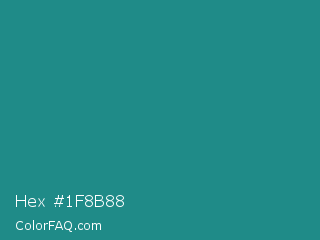 Hex #1f8b88 Color is a normal cyan color and the nearest color is Lochinvar #2c8c84. Hex code #1f8b88 and RGB value is rgb(31,139,136). In RGB color space, this color is composed of 12% red, 55% green, 53% blue, In CMYK color space, this color is composed of 78% cyan, 0% magenta, 2% yellow , 45% black , In HSL color space, this color has a hue angle of 178° , 64% saturation and 33% lightness.