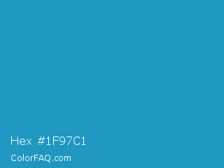 Hex #1f97c1 Color is a normal blue color and the nearest color is Cyan Cornflower Blue #188bc2. Hex code #1f97c1 and RGB value is rgb(31,151,193). In RGB color space, this color is composed of 12% red, 59% green, 76% blue, In CMYK color space, this color is composed of 84% cyan, 22% magenta, 0% yellow , 24% black , In HSL color space, this color has a hue angle of 196° , 72% saturation and 44% lightness.