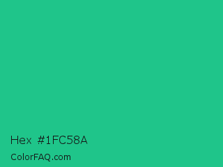 Hex #1fc58a Color is a normal green color and the nearest color is Mountain Meadow Crayola #1ab385. Hex code #1fc58a and RGB value is rgb(31,197,138). In RGB color space, this color is composed of 12% red, 77% green, 54% blue, In CMYK color space, this color is composed of 84% cyan, 0% magenta, 30% yellow , 23% black , In HSL color space, this color has a hue angle of 159° , 73% saturation and 45% lightness.