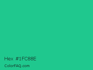 Hex #1fc88e Color is a normal green color and the nearest color is Mountain Meadow #30ba8f. Hex code #1fc88e and RGB value is rgb(31,200,142). In RGB color space, this color is composed of 12% red, 78% green, 56% blue, In CMYK color space, this color is composed of 85% cyan, 0% magenta, 29% yellow , 22% black , In HSL color space, this color has a hue angle of 159° , 73% saturation and 45% lightness.