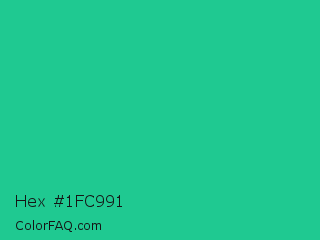 Hex #1fc991 Color is a normal green color and the nearest color is Shamrock #33cc99. Hex code #1fc991 and RGB value is rgb(31,201,145). In RGB color space, this color is composed of 12% red, 79% green, 57% blue, In CMYK color space, this color is composed of 85% cyan, 0% magenta, 28% yellow , 21% black , In HSL color space, this color has a hue angle of 160° , 73% saturation and 45% lightness.