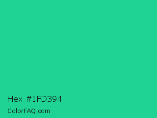 Hex #1fd394 Color is a normal green color and the nearest color is Shamrock #33cc99. Hex code #1fd394 and RGB value is rgb(31,211,148). In RGB color space, this color is composed of 12% red, 83% green, 58% blue, In CMYK color space, this color is composed of 85% cyan, 0% magenta, 30% yellow , 17% black , In HSL color space, this color has a hue angle of 159° , 74% saturation and 47% lightness.