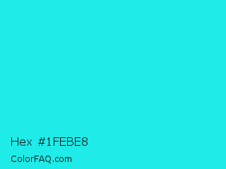 Hex #1febe8 Color is a normal cyan color and the nearest color is Loeen #15f2fd. Hex code #1febe8 and RGB value is rgb(31,235,232). In RGB color space, this color is composed of 12% red, 92% green, 91% blue, In CMYK color space, this color is composed of 87% cyan, 0% magenta, 1% yellow , 8% black , In HSL color space, this color has a hue angle of 179° , 84% saturation and 52% lightness.
