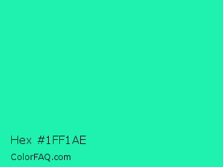 Hex #1ff1ae Color is a normal green color and the nearest color is Medium Spring Green #00fa9a. Hex code #1ff1ae and RGB value is rgb(31,241,174). In RGB color space, this color is composed of 12% red, 95% green, 68% blue, In CMYK color space, this color is composed of 87% cyan, 0% magenta, 28% yellow , 5% black , In HSL color space, this color has a hue angle of 161° , 88% saturation and 53% lightness.