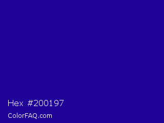 Hex #200197 Color is a dark indigo color and the nearest color is Ultramarine #120a8f. Hex code #200197 and RGB value is rgb(32,1,151). In RGB color space, this color is composed of 13% red, 0% green, 59% blue, In CMYK color space, this color is composed of 79% cyan, 99% magenta, 0% yellow , 41% black , In HSL color space, this color has a hue angle of 252° , 99% saturation and 30% lightness.