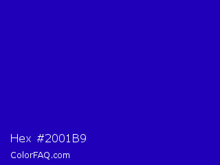 Hex #2001b9 Color is a normal indigo color and the nearest color is Interdimensional Blue #360ccc. Hex code #2001b9 and RGB value is rgb(32,1,185). In RGB color space, this color is composed of 13% red, 0% green, 73% blue, In CMYK color space, this color is composed of 83% cyan, 99% magenta, 0% yellow , 27% black , In HSL color space, this color has a hue angle of 250° , 99% saturation and 36% lightness.