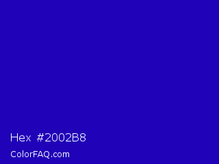 Hex #2002b8 Color is a normal indigo color and the nearest color is Interdimensional Blue #360ccc. Hex code #2002b8 and RGB value is rgb(32,2,184). In RGB color space, this color is composed of 13% red, 1% green, 72% blue, In CMYK color space, this color is composed of 83% cyan, 99% magenta, 0% yellow , 28% black , In HSL color space, this color has a hue angle of 250° , 98% saturation and 36% lightness.