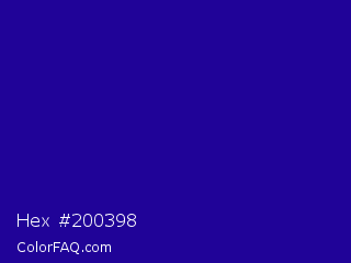 Hex #200398 Color is a dark indigo color and the nearest color is Ultramarine #120a8f. Hex code #200398 and RGB value is rgb(32,3,152). In RGB color space, this color is composed of 13% red, 1% green, 60% blue, In CMYK color space, this color is composed of 79% cyan, 98% magenta, 0% yellow , 40% black , In HSL color space, this color has a hue angle of 252° , 96% saturation and 30% lightness.