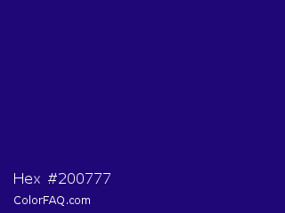 Hex #200777 Color is a dark indigo color and the nearest color is Deep Blue #220878. Hex code #200777 and RGB value is rgb(32,7,119). In RGB color space, this color is composed of 13% red, 3% green, 47% blue, In CMYK color space, this color is composed of 73% cyan, 94% magenta, 0% yellow , 53% black , In HSL color space, this color has a hue angle of 253° , 89% saturation and 25% lightness.