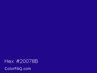 Hex #20078b Color is a dark indigo color and the nearest color is Blue Gem #2c0e8c. Hex code #20078b and RGB value is rgb(32,7,139). In RGB color space, this color is composed of 13% red, 3% green, 55% blue, In CMYK color space, this color is composed of 77% cyan, 95% magenta, 0% yellow , 45% black , In HSL color space, this color has a hue angle of 251° , 90% saturation and 29% lightness.