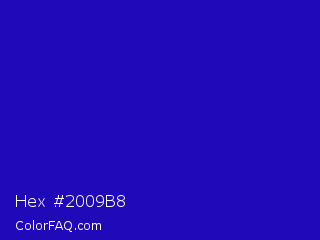 Hex #2009b8 Color is a normal indigo color and the nearest color is Interdimensional Blue #360ccc. Hex code #2009b8 and RGB value is rgb(32,9,184). In RGB color space, this color is composed of 13% red, 4% green, 72% blue, In CMYK color space, this color is composed of 83% cyan, 95% magenta, 0% yellow , 28% black , In HSL color space, this color has a hue angle of 248° , 91% saturation and 38% lightness.