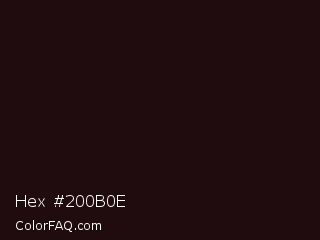 Hex #200b0e Color is a almost black red color and the nearest color is Night Rider #1f120f. Hex code #200b0e and RGB value is rgb(32,11,14). In RGB color space, this color is composed of 13% red, 4% green, 5% blue, In CMYK color space, this color is composed of 0% cyan, 66% magenta, 56% yellow , 87% black , In HSL color space, this color has a hue angle of 351° , 49% saturation and 8% lightness.