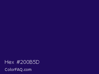 Hex #200b5d Color is a very dark indigo color and the nearest color is Violent Violet #290c5e. Hex code #200b5d and RGB value is rgb(32,11,93). In RGB color space, this color is composed of 13% red, 4% green, 36% blue, In CMYK color space, this color is composed of 66% cyan, 88% magenta, 0% yellow , 64% black , In HSL color space, this color has a hue angle of 255° , 79% saturation and 20% lightness.