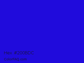 Hex #200bdc Color is a normal indigo color and the nearest color is Bluebonnet #1c1cf0. Hex code #200bdc and RGB value is rgb(32,11,220). In RGB color space, this color is composed of 13% red, 4% green, 86% blue, In CMYK color space, this color is composed of 85% cyan, 95% magenta, 0% yellow , 14% black , In HSL color space, this color has a hue angle of 246° , 90% saturation and 45% lightness.