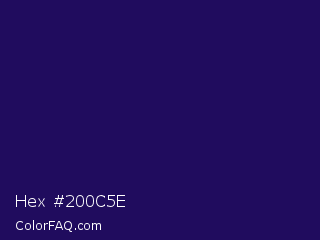 Hex #200c5e Color is a very dark indigo color and the nearest color is Violent Violet #290c5e. Hex code #200c5e and RGB value is rgb(32,12,94). In RGB color space, this color is composed of 13% red, 5% green, 37% blue, In CMYK color space, this color is composed of 66% cyan, 87% magenta, 0% yellow , 63% black , In HSL color space, this color has a hue angle of 255° , 77% saturation and 21% lightness.