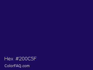 Hex #200c5f Color is a very dark indigo color and the nearest color is Violent Violet #290c5e. Hex code #200c5f and RGB value is rgb(32,12,95). In RGB color space, this color is composed of 13% red, 5% green, 37% blue, In CMYK color space, this color is composed of 66% cyan, 87% magenta, 0% yellow , 63% black , In HSL color space, this color has a hue angle of 254° , 78% saturation and 21% lightness.